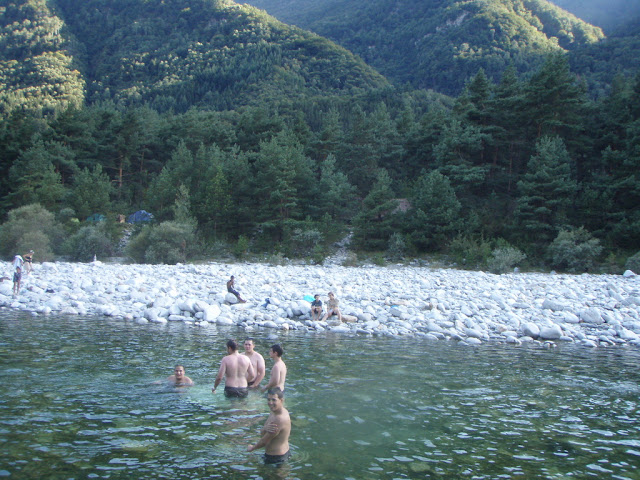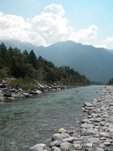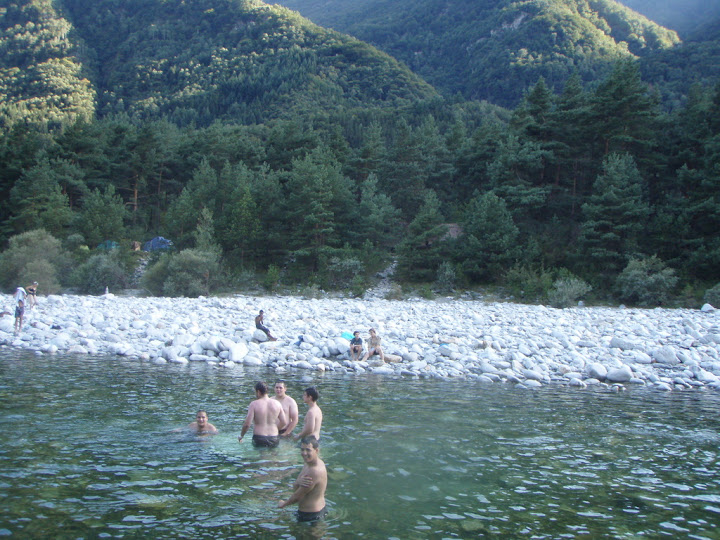 La chaleur accable. Lundi, arrivés à 16h après le train Lausanne-Lucerne, Lucerne-Locarno, le bus Locarno-Maggia Centrale, la marche Maggia Centrale-Terra di Fuori, un peu claqués, on n'a pas le temps de faire grand chose, sinon les tentes.
